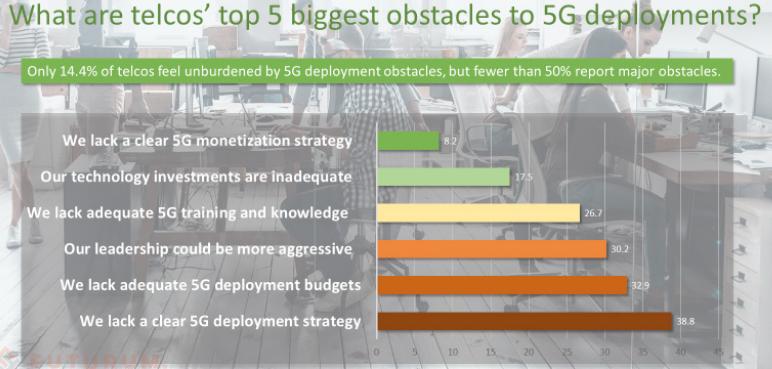 Of the challenges experts say they face for this ambitious rollout schedule, first on the list is lack of a clear 5G deployment strategy (38 percent) followed by lack of adequate budget (32 percent) followed by leadership apathy (30 percent.) Rounding out the list are a pair of perennial problems, a lack of 5G training and specialized knowledge (26.7 percent) and inadequate technology investments (17.5 percent.)