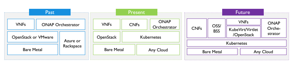As discussed in birds-of-a-feather (BoF) – Telecom User Group session delivered by Kohn that – with the progress of Kubernetes for cloud-native movement, it is expected that CNFs will be a key workload type. Kubernetes will be used to orchestrate CNFs as well as VNFs. VNFs will be segregated with KubeVirt or Virtlet or OpenStack on top of Kubernetes.