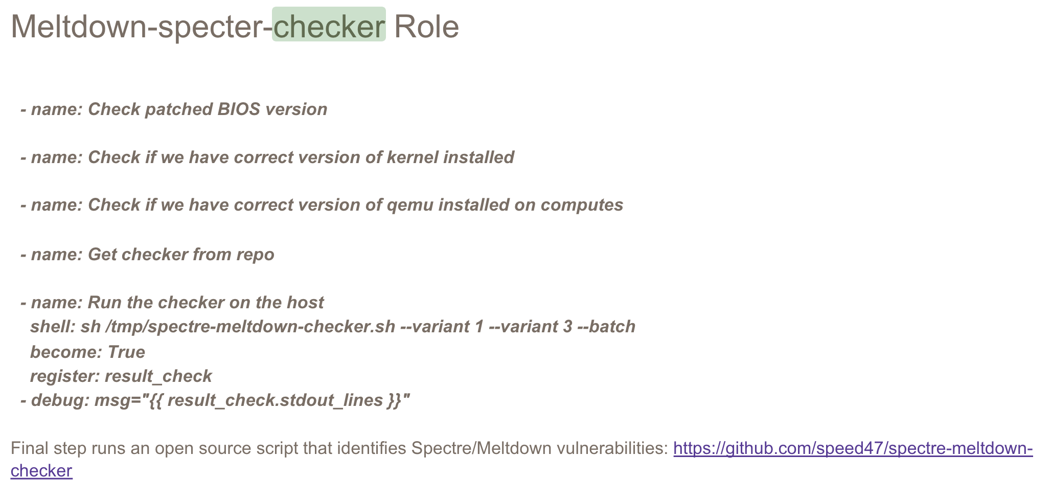 Bruno Bompastor and Adrian Joian, from eBay’s cloud reliability team, shared how shoring up their system against these vulnerabilities stretched from January until July. One of the takeaways? First that Ansible is a great tool for infrastructure automation. “We decided to use Ansible as our main tool and heavily relied on Ansible roles as a way to organize tasks,” Bompastor says. As an example, the team has OpenStack roles, hardware roles, update roles and — the most important one for this project — the checker role, to scan for these vulnerabilities. They ran a checker on the host (an open-source script that basically tests the variants they wanted to check). Available on GitHub, “it’s a very nice script that covers everything like this…”