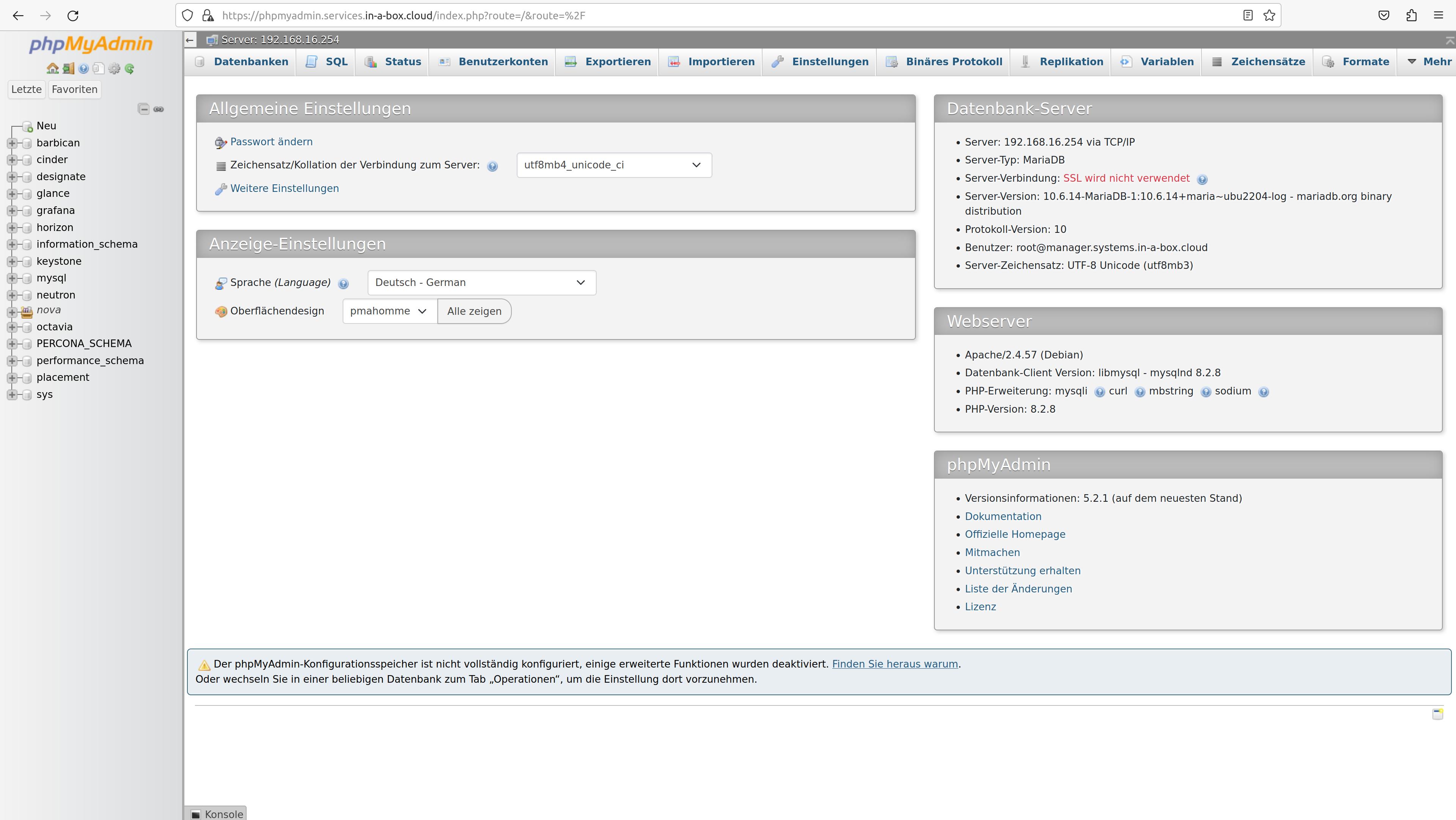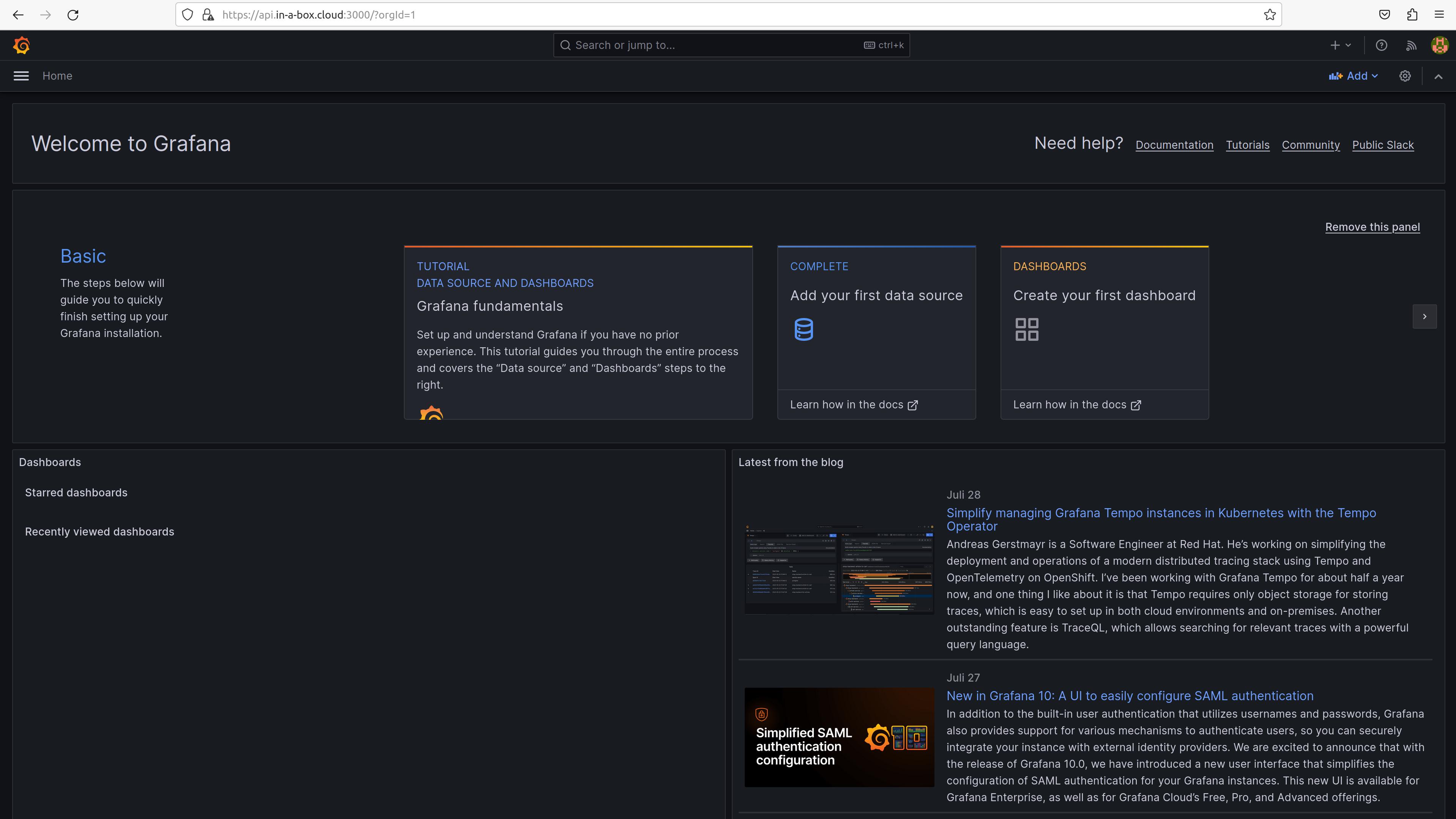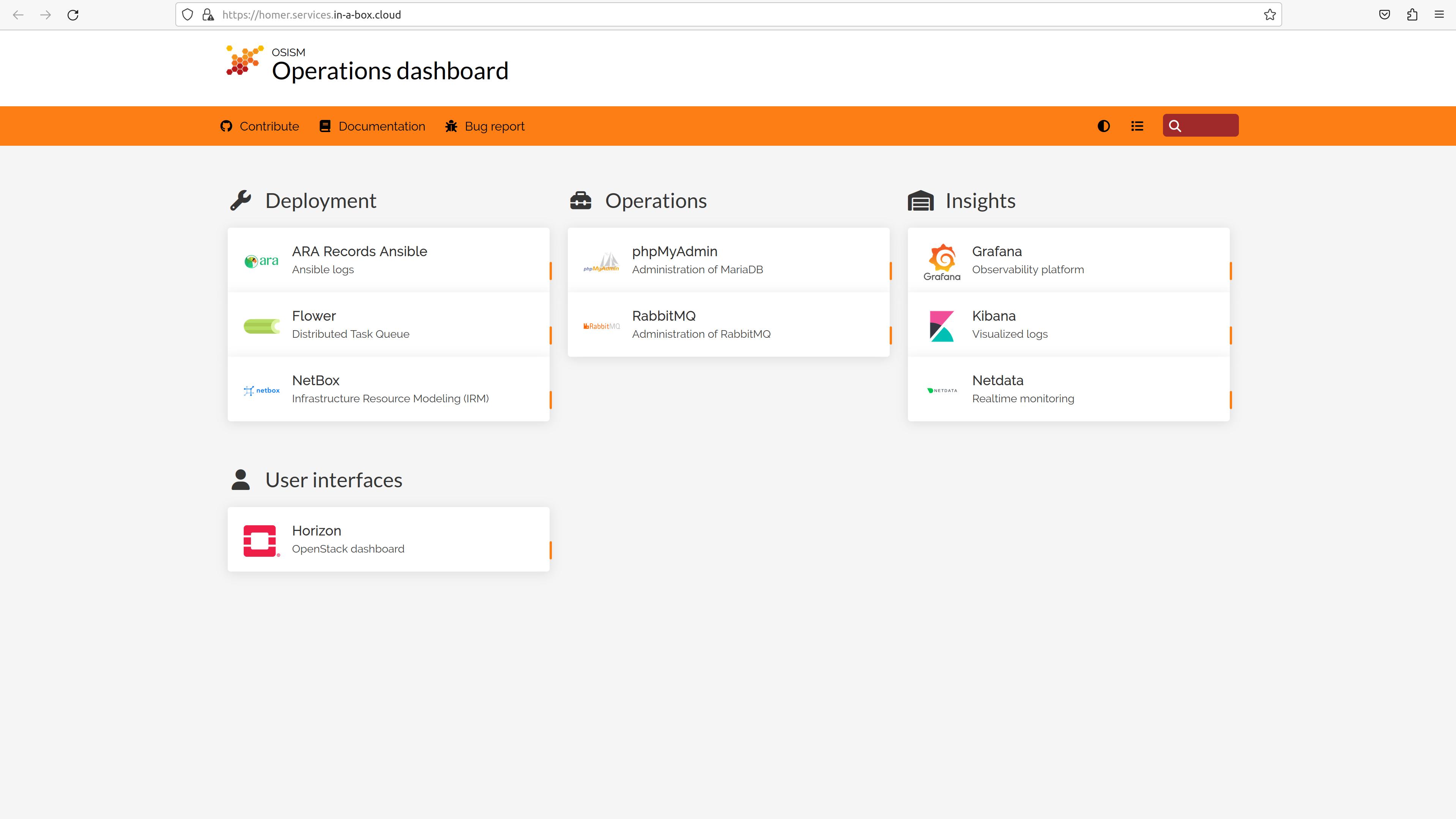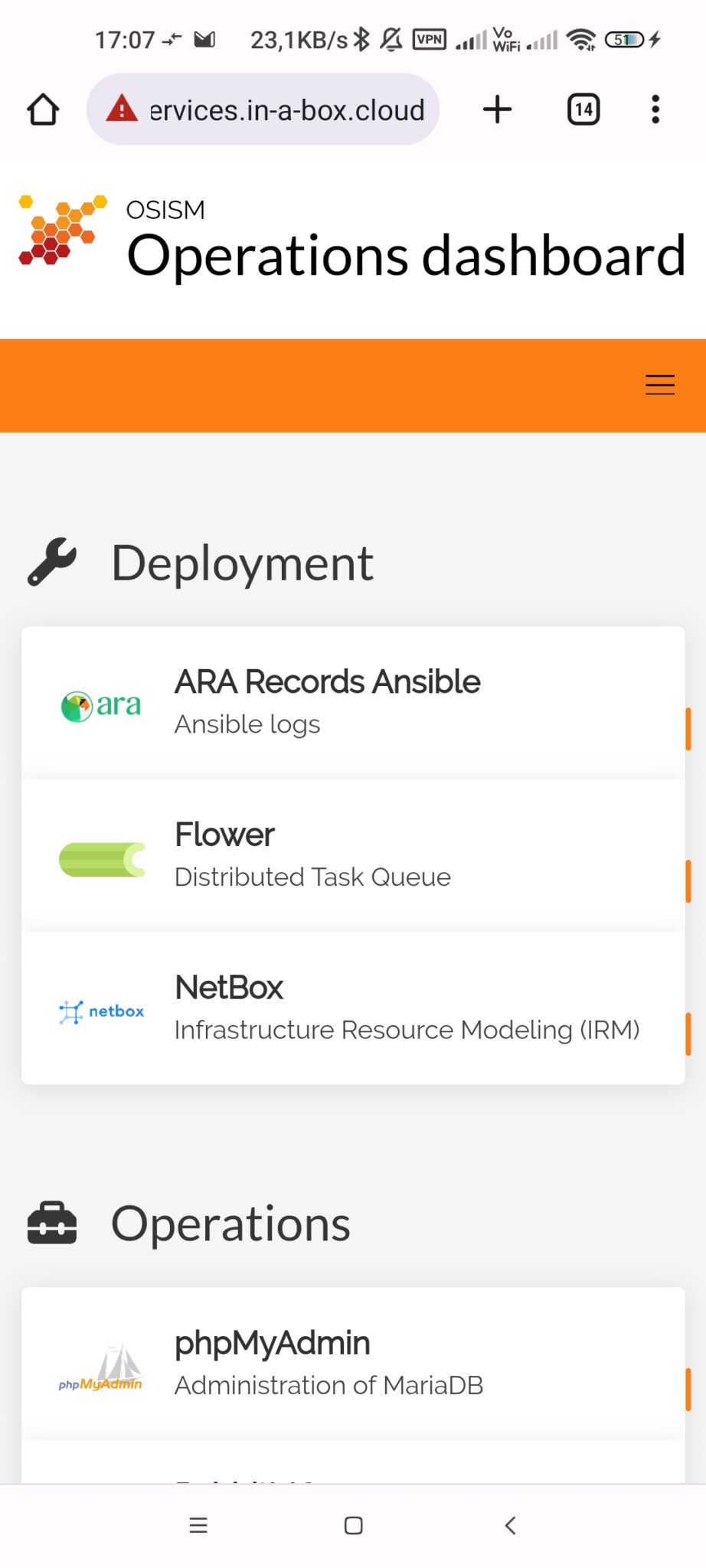 Now it’s getting exciting: my first check is on the URL of the Homer service, the operations dashboard: https://homer.services.in-a-box.cloud – and… whoops the page is there. I won’t go into the special features of the certificates and some browsers here, that would be worth a separate entry.