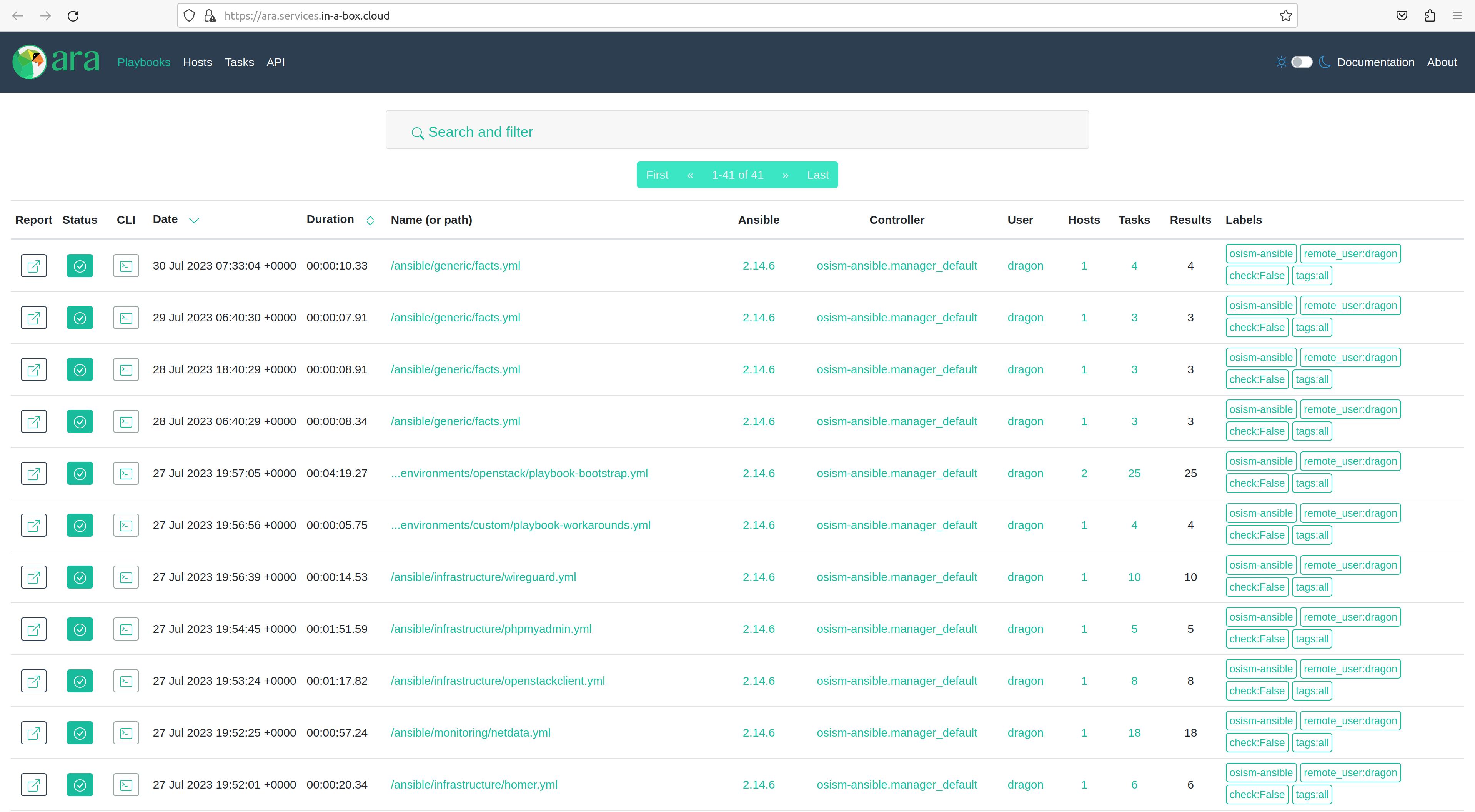 ARA. In this web UI, I can find the reports on the Ansible playbooks to get a first impression of how the deployment went. In my case of attempt number four, only one playbook was throwing an error.