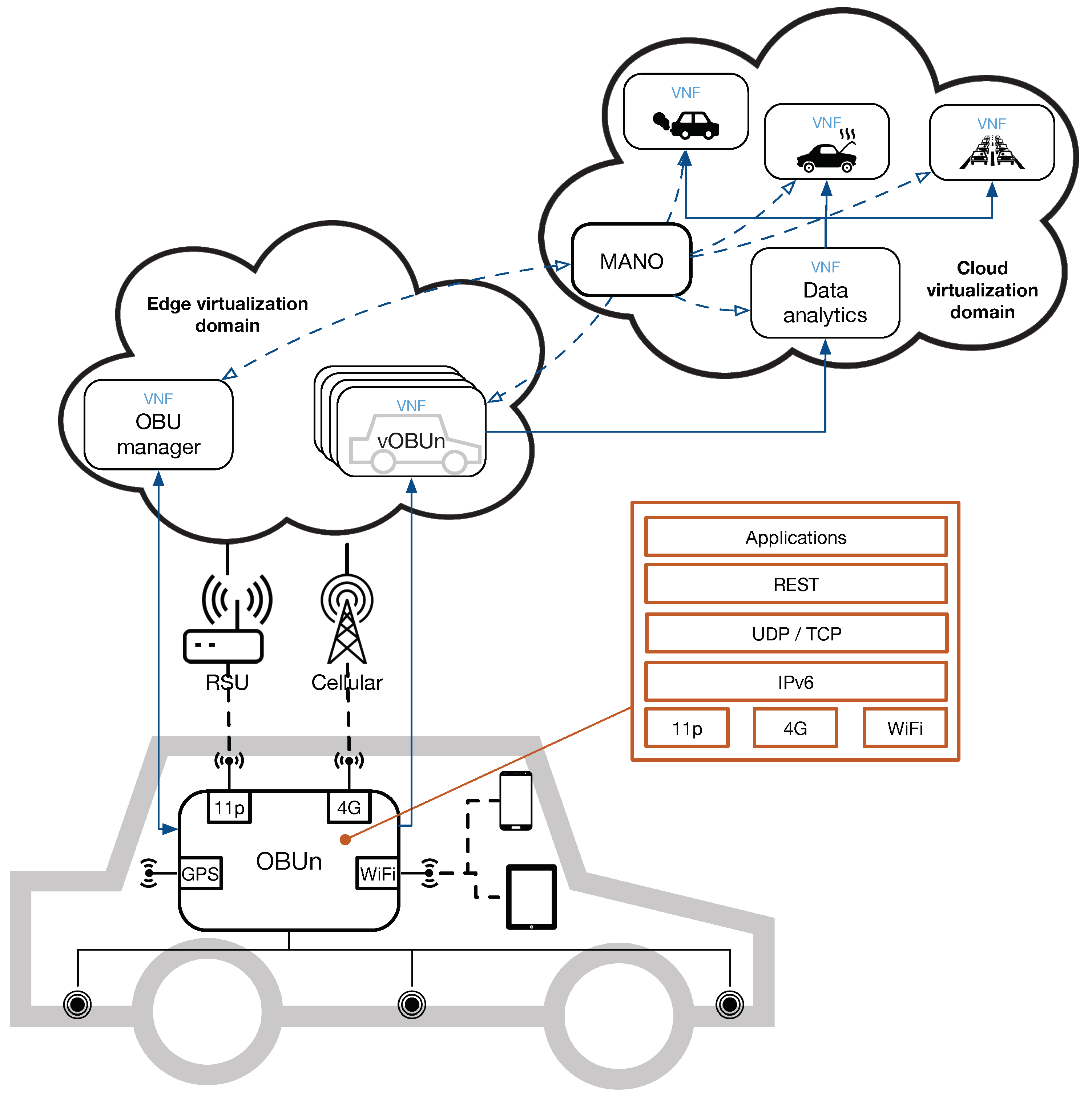 This solution virtualizes functionality of physical OBUs in form of virtual network functions (VNFs) which are hosted on the middle layer or edge of the network (roadside units, cellular base stations, WiFi access points, etc.) Data pre-processing tasks like analysis, pattern recognition and aggregation of raw data are carried out by these VNFs, which are in turn are managed by NFV based at edge and further pushed to cloud for high-volume global big data analysis. The processed insights are then accessed by OBUs deployed inside vehicles from vOBUs or a data-analytics module.