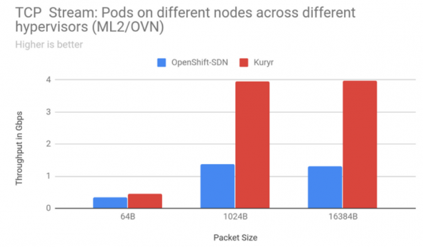Kuryr is an OpenStack project that relies on Neutron and Octavia to provide connectivity for Kubernetes Pods and Services. This improves the network performance especially when running Kubernetes clusters on top of OpenStack Virtual Machines with Kuryr. It avoids double encapsulation of network packets as only the Neutron overlay is used and consequently simplifies the network stack and facilitates debugging. The following diagram shows the gain of using Kuryr when compared to using Openshift SDN with TCP stream traffic between Pods on nodes across different hypervisors.