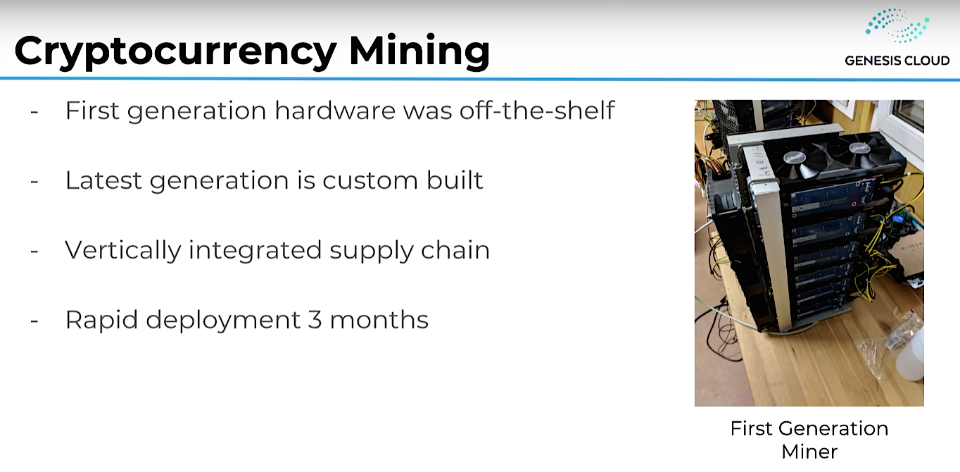 The first generation miner was, well, a little artisanal, Sprung admits. “From a classical data center point of view, you might find it unprofessional, but this off-the-shelf hardware it allowed us to quickly get it started and open up those first small data centers.” The team quickly realized the potential and was soon building custom-designed mining hardware with their own server nodes designed for that purpose. Today, Genesis Mining has a completely vertically integrated supply chain, manufacturing their gear in China. They get their their own GPUs with custom tweaks and modifications as needed, making them one of the top customers of both AMD and NVIDIA.