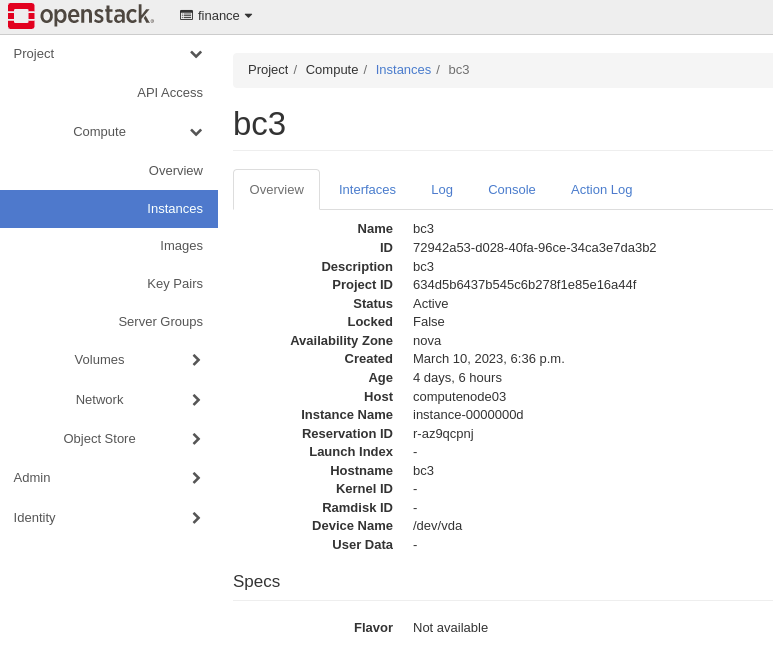 First, I will connect to the instance bc3 and inspect the attached volume. To do that we need to know where bc3 is running. In which, compute node was deployed to the VM, we can get that info by checking the BUI, specifically the Overview>Host=computenode03: