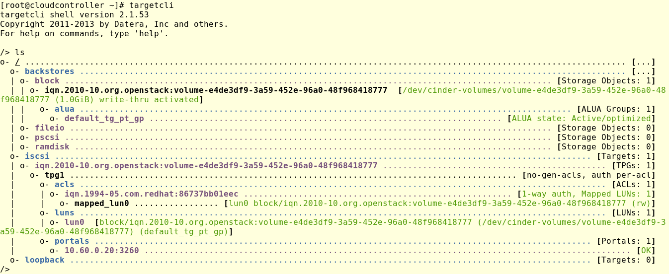 [root@cloudcontroller ~]# targetcli targetcli shell version 2.1.53 Copyright 2011-2013 by Datera, Inc and others. For help on commands, type 'help'. /> ls