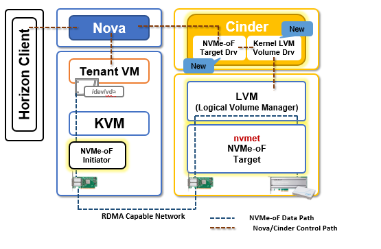 Support of NVMe-oF in OpenStack was made available from the Rocky release. A proposed solution requires RDMA NICs and supports kernel initiator and kernel target.