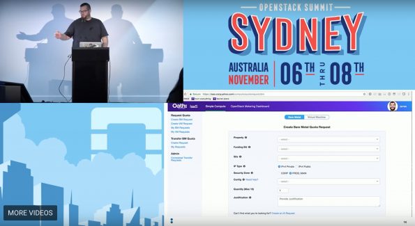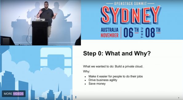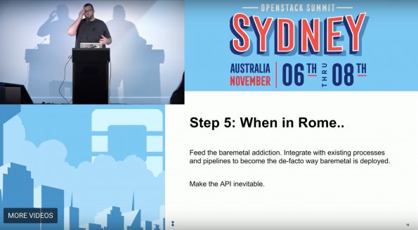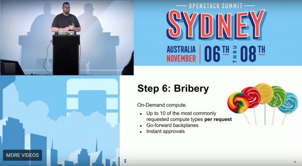 Now people at the organization were using VM for their sandbox environments. They were doing development work, innovating, seeing some agility. The company, however, was still focused on (“addicted to”) bare metal. Penick told them that his team would support Bare Metal, but only by integrating with the existing processes that the company used to acquire Bare Metal. “It took about thirty to ninety days to get physical compute resources, so we’re gonna slide into that and we’re gonna become a part of that,” he said. “And this means that you have to sit and you have to work very closely with supply chain teams, property architects, (and) application architects to influence them and convince them to want to use this thing.” No matter what, said Penick, there needed to be an OpenStack API between the user and the infrastructure.