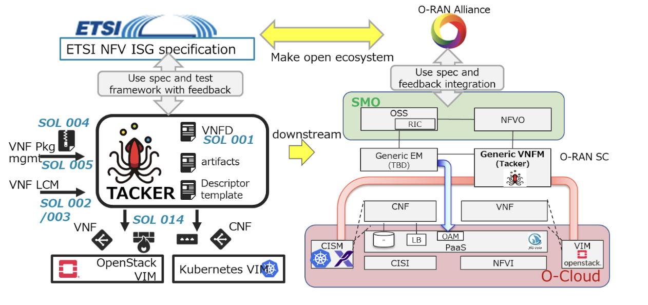 In order to manage multi-vendor VNFs for multi-domain on multi-clouds, unified specification is important for DOCOMO. OpenStack Tacker is key bridge among operator development, standards and open sources as figure 3. Tacker has proven that it can be operated as a generic VNFM that is compliant with the ETSI NFV Standard, resolving various lessons.