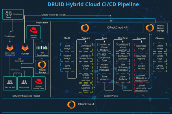 Cornutt highlighted one of his team’s recent hybrid cloud success stories with US ARMY Applied Cyber Technologies (ACT). ACT, part of the Defense Cyber Operations (DCO) program, needed a hybrid cloud CI/CD solution to automate the building, hardening, testing, and reporting of baseline VMs for all DCO systems. D.R.U.I.D. (Defense Cyber Operations Resource for Updates, Innovation and Development) – is built on a combination of ORock’s and DCO’s OpenStack clouds, relying on Ceph object storage for intelligent syncing of artifacts between environments.