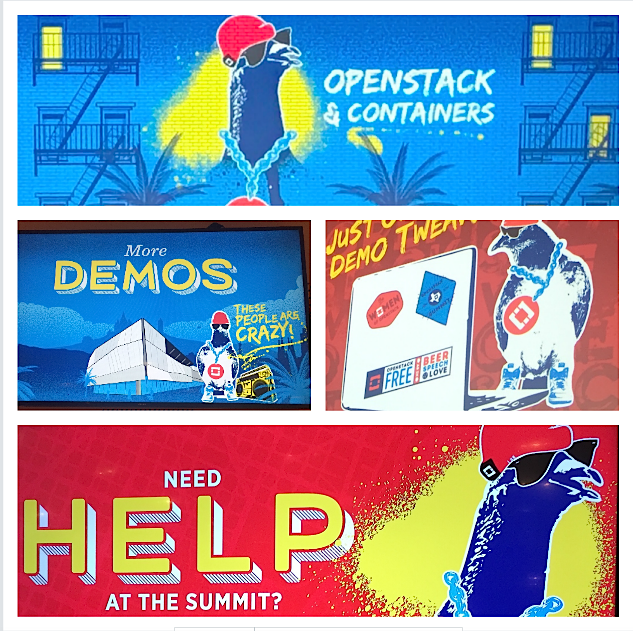 “We started with the graffiti on buildings illustrations and ended up with a lot of it,” says Morey. “So we decided we needed to invent a character who was applying all this OpenStack graffiti. A pigeon with OpenStack passion and a bit of attitude just felt right.”