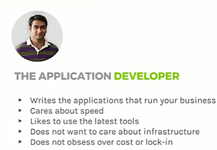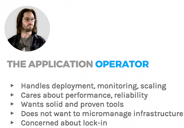 The second persona is Bertram, the application operator. Bertram handles the deployment, monitoring and scaling of the apps that Dinesh writes. (These personas may overlap.) In some companies, the Dineshs and Bertrams share the same desks and offices. But in lot of companies they are slightly different roles, with different priorities — Bertram cares a lot about performance and reliability more than he cares about speed, for example. He’s the one on call, so he wants solid and proven tools because he doesn’t want to be caught at 10 p.m. on a Saturday because something caught fire in production. Bertram doesn’t want to micromanage infrastructure but he still wants to look under the hood to understand how it works, he still wants to understand enough to select the right technology. Finally, Bertram is concerned about lock-in, because he likes to pick the best technical tool and being locked reduces his options.