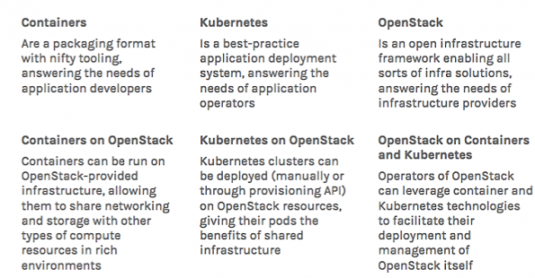 In conclusion: containers are a packaging format with good tooling, ensuring the needs of application developers. Kubernetes is a best-practice application deployment system ensuring the needs of app operators. OpenStack is an infrastructure framework enabling all sorts of infrastructure solutions, ensuring the needs of infrastructure providers.