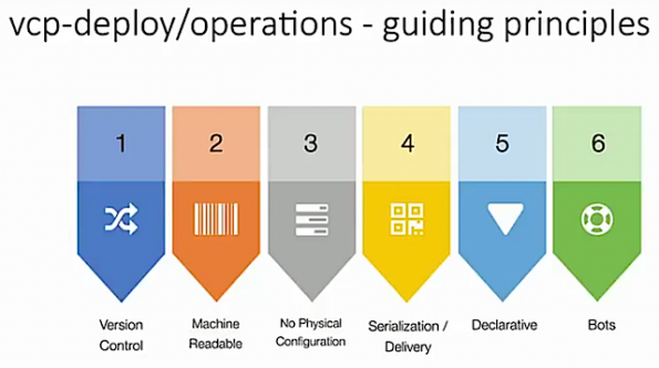 “We like to define it as a large-scale cloud. It’s built with OpenStack,” Hendrickson says. He outlines six guiding principles around VCP: Version control, machine readable, no physical configuration, serialization/delivery, declarative and bots.