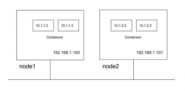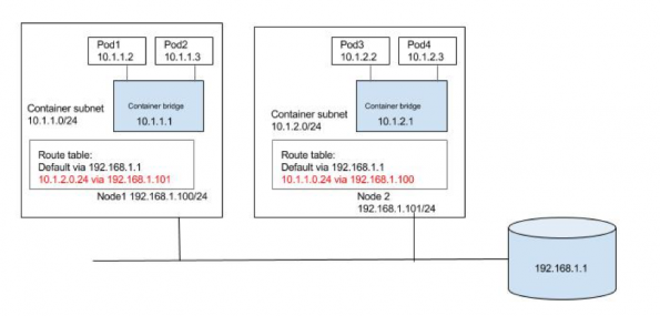 We could populate the default gateway router with routes for the subnet as shown in the below diagram. Routes to 10.1.1.0/24 and 10.1.2.0/24 are configured to be through node1 and node2 respectively. We could automate keeping the route tables updated as nodes are added or deleted in to the cluster. We can also use some of the container networking solutions which can do the job on public clouds, for e.g. Flannel’s backend for AWS and GCE, Weave’s AWS-VPC mode, etc.
