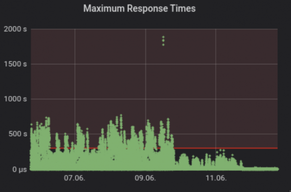 When scaling up the infrastructure, we noticed that all requests involving the database were slow. Looking at the request logs, we realized that the inspector as the other component running on the controller gets a list of all nodes to clean up its database every 60 seconds. In addition, we had disabled pagination when we reached 1,000 nodes, which means that every request that went to the API assembled all the nodes in one giant request and tried to give that back to the requester.