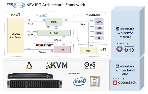 For this first edition, Whitestack invited a number of vendors and projects that provide a complete end-to-end service chain, covering critical parts of a typical mobile network. Specifically, the following VNF vendors were integrated to provide a fully-functional and automated network service: