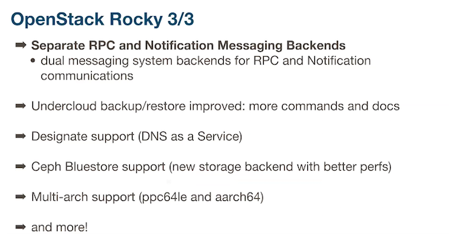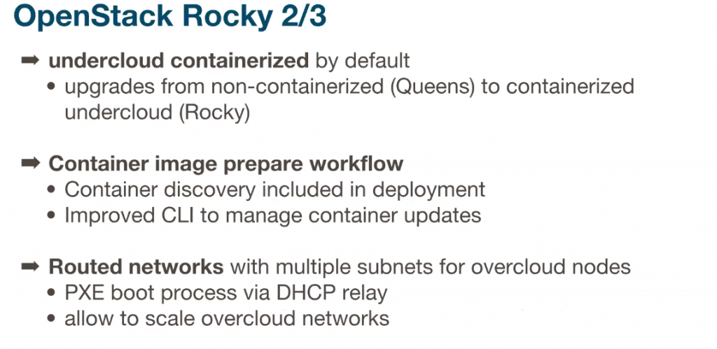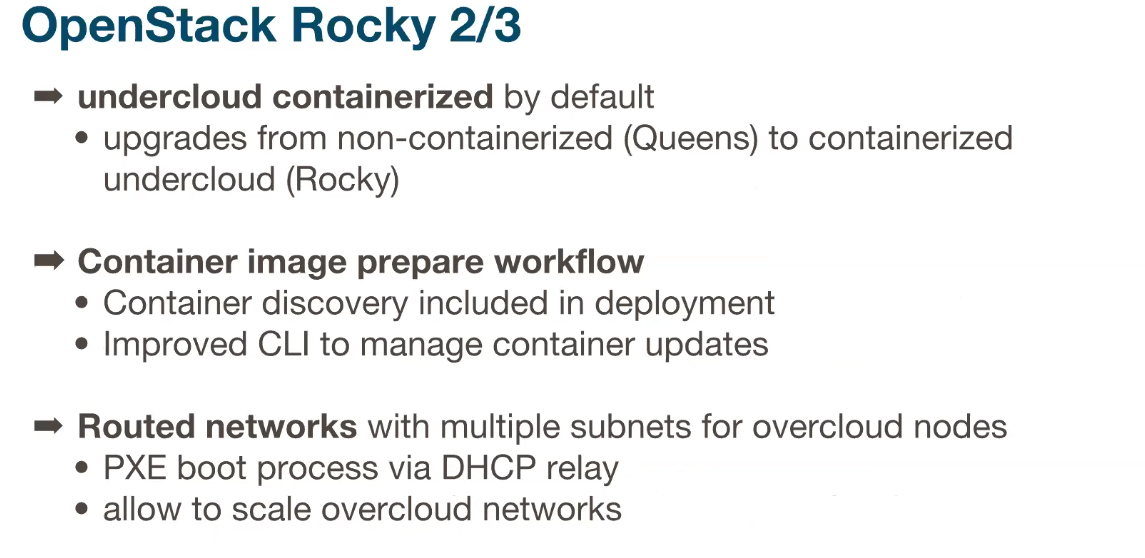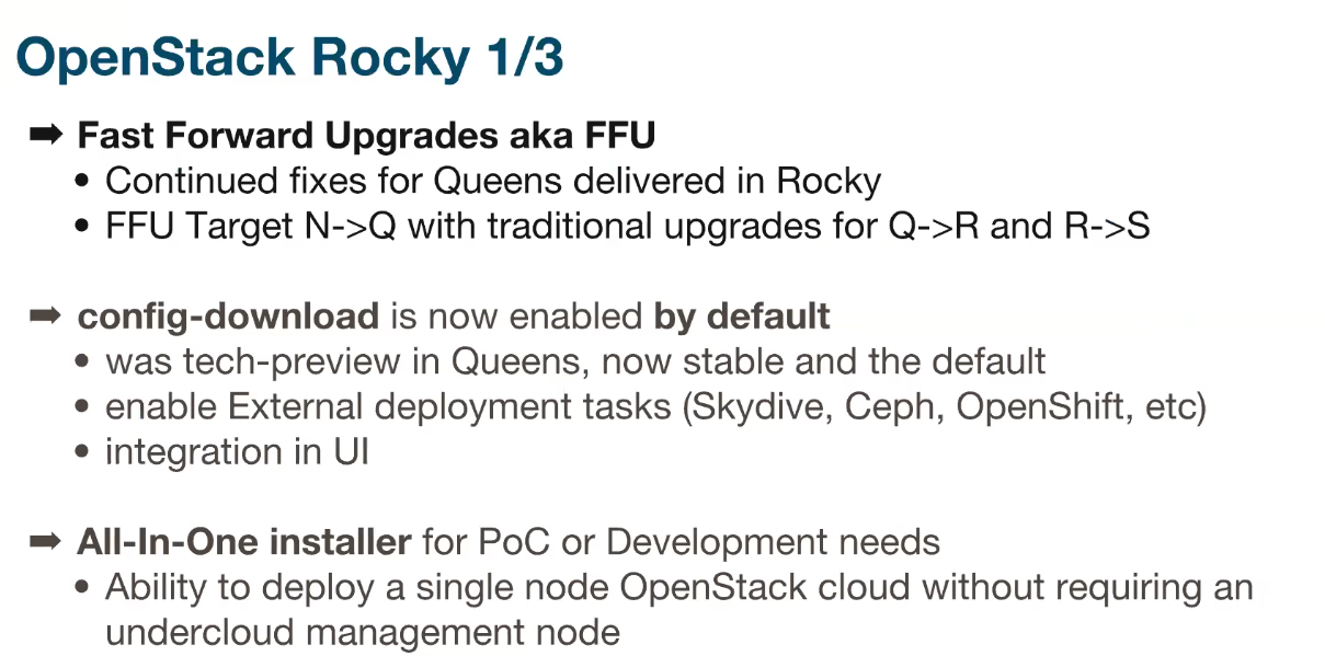 Alex Schultz, project team lead for the Queens and Rocky cycles, offered this update on the TripleO fast forward upgrade front, starting at the 9:53 mark. “We provide tooling for planning deployment and day two operations,” says Shultz by way of introduction. “We support advanced network topologies, allowing operators and deployers to configure their services as necessary as well as offer support for updates and upgrades.