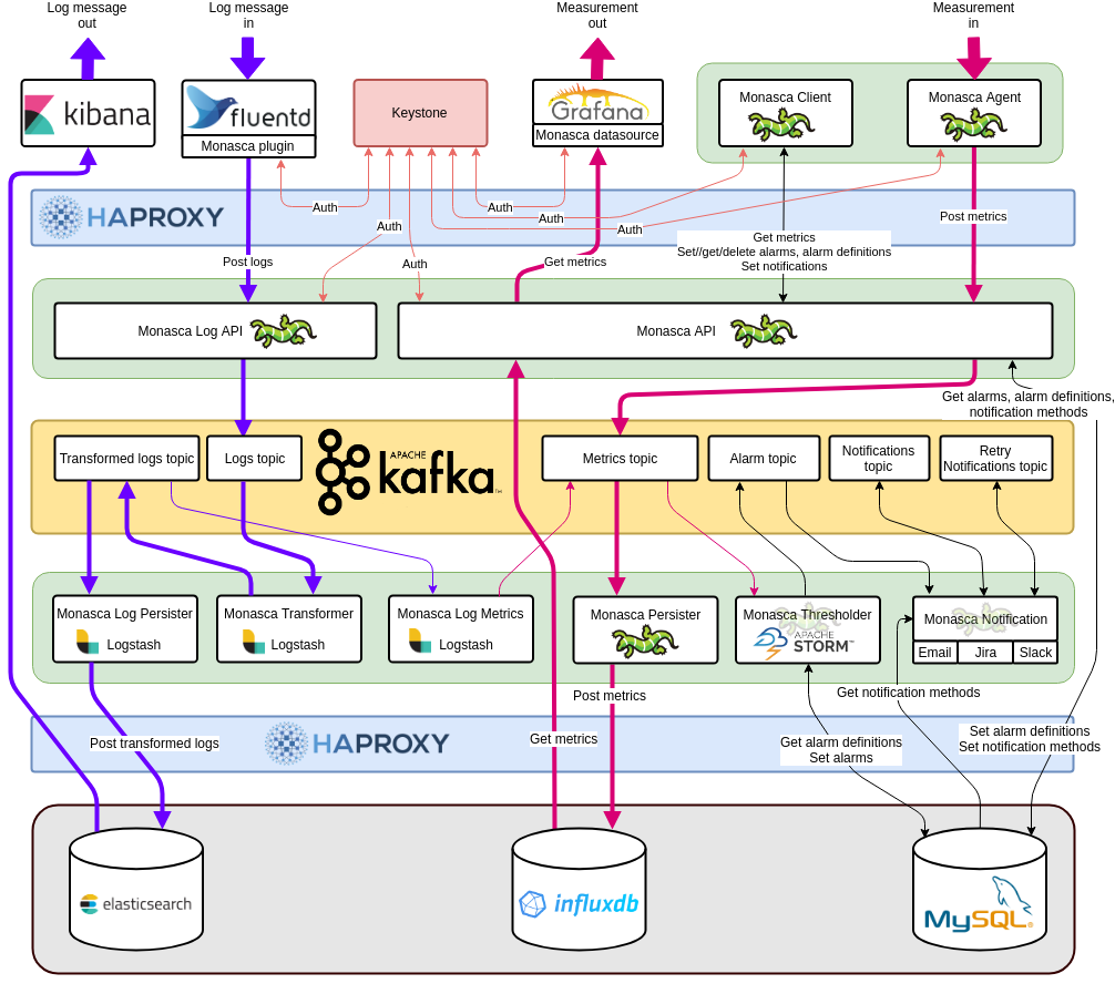 The important thing to note:  almost everything in the diagram can be deployed in a highly available configuration. What’s even better is that this is all managed by Kolla-Ansible out-of-the-box. If you want a three node Monasca deployment then simply add your three monitoring nodes to the Kolla-Ansible inventory, and follow the Kolla documentation to deploy them. Of course, it’s worth mentioning that currently this will use the same database and load balancing services as other components in Kolla-Ansible. If this is a concern, or you’re not using Kolla-Ansible to manage your OpenStack deployment, then you can deploy Monasca standalone  and integrate, if you wish, with an external instance of Keystone that needn’t be provided by Kolla.